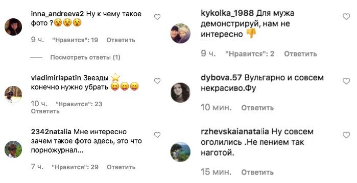 Одни поклонники восхитились красотой певицы, но многие решили, что ей пора прекращать делать подобные фото. Злопыхатели осудили молодую маму и заверили, что она стала выглядеть вульгарно. «Ну к чему такое фото?», «Зачем такое фото здесь? Это что, порножурнал?», «Для мужа демонстрируй, нам не интересно», «Вульгарно и совсем некрасиво! Фу», «Ну совсем оголилась. Ни пением, так наготой», — стали негодовать подписчики.