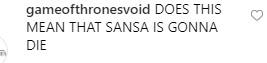 «Это спойлер?» — поинтересовался другой. «Это значит, что Санса умрет?» — испугался следующий. «Девочка, если на этом снимке ты мертва, я заблокирую тебя! Не играй со мной!» — предупредила еще одна фанатка. «Ты определенно выглядишь тут мертвой, ну да ладно», — отметил другой.
