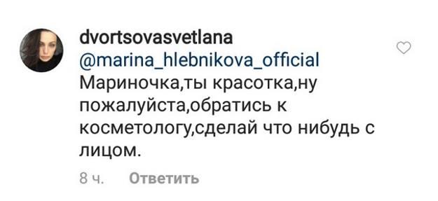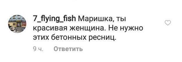 «Всему виной пластика и погоня за молодостью… Вот теперь приходится в буквальном смысле рисовать лицо», «Мариночка, зачем столько косметики! Морщинками надо гордиться… слишком ярко!», «Мариночка, ты красотка! Ну, пожалуйста, обратись к косметологу…», «Маришка, ты красивая женщина. Не нужно этих бетонных ресниц», – такие комментарии появились под свежим снимком певицы на ее личной страничке в микроблоге.