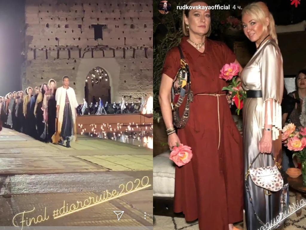 Перед тем как отправиться на показ Dior, Яна Рудковская посетила маленькую выставку. На ней были представлены круизные наряды 1960-х годов, которые Ив Сен-Лоран лично сшил для модного дома. После ужина в роскошном марокканском ресторане продюсер подготовилась к выходу в свет.