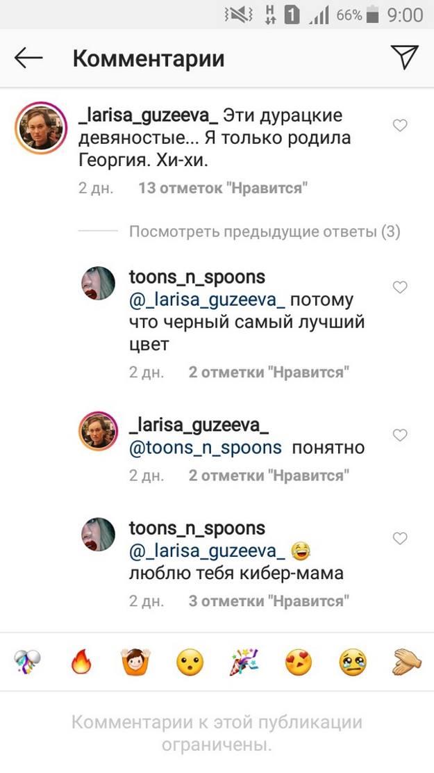 Наследница актрисы разместила на личной страничке архивные кадры с мамой. Лариса Гузеева (Фото: Globallookpress.com) Дочка ведущей шоу «Давай поженимся» на Первом канале Ларисы Гузеевой Ольга разместила на личной страничке в Instagram архивные фото, на которых запечатлена ее мама. Актриса не смогла смолчать, увидев раритетные кадры в микроблоге своей наследницы. 59-летняя Лариса прокомментировала публикацию 19-летней Лёли (Так близкие называют девушку дома, — Прим. ред.). Напомнив, что тогда она только-только родила сына. «Раз надо — худейте»: Гузеева открытым текстом ответила поклоннице на ее замечание Ведущей программы «Давай поженимся» посоветовали избавиться от лишних килограммов. Та не полезла за словом в карман. Дочка актрисы показала маму в юности (Фото: Instagram.com/toons_n_spoons) «Эти дурацкие девяностые… Я только родила Георгия. Хи-хи», — отметила Гузеева, оценив свои снимки, которые были сделаны в юности. В ответ дочка телеведущей отправила маме смайл. «Что на языке смайликов означает чёрное сердечко?» — обратилась к наследнице актриса. «Люблю тебя кибер-мама», — лаконично ответила Лёля. Лариса Гузеева прокомментировала свои снимки на страничке дочери в микроблоге (Фото: Instagram.com/toons_n_spoons) Ранее Лариса Гузеева вступала в переписку с одной из своих поклонниц. Тогда ей указали на лишний вес, однако сама актриса заявила, что не собирается худеть. Телеведущая вполне довольна своей внешностью.