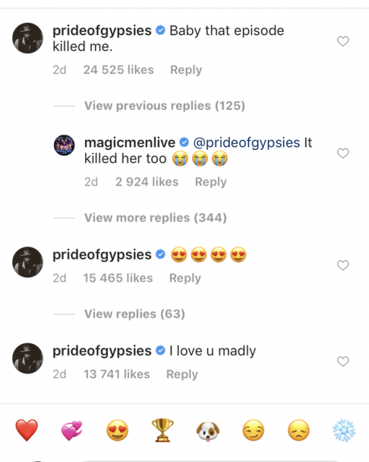 «Детка, этот эпизод убил и меня тоже» , — написал он в первом комментарии. Затем добавил несколько смайликов с влюбленным взглядом и добавил: «Я безумно люблю тебя».