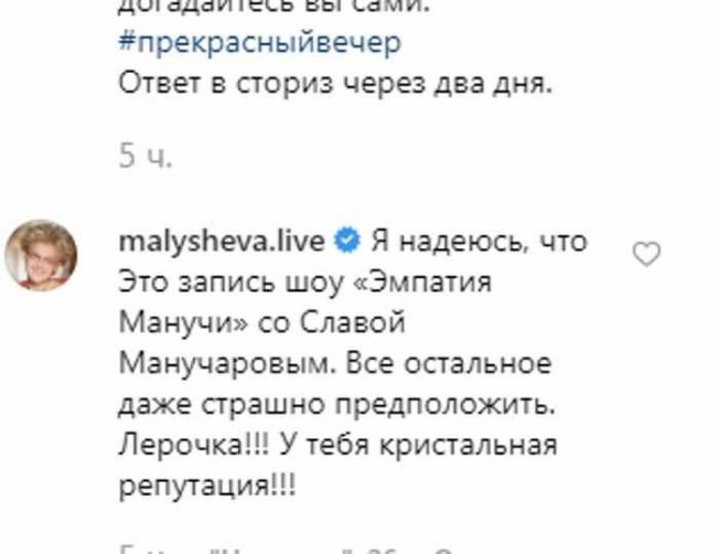 Пользователи стали гадать, с кем могла сделать такой странный снимок яркая исполнительница. Одной из тех, кто высказал свое предположение, стала популярная телеведущая Елена Малышева. «Я надеюсь, что это запись шоу «Эмпатия Манучи» со Славой Манучаровым. Все остальное даже страшно предположить. Лерочка!!! У тебя кристальная репутация!» — заявила она.