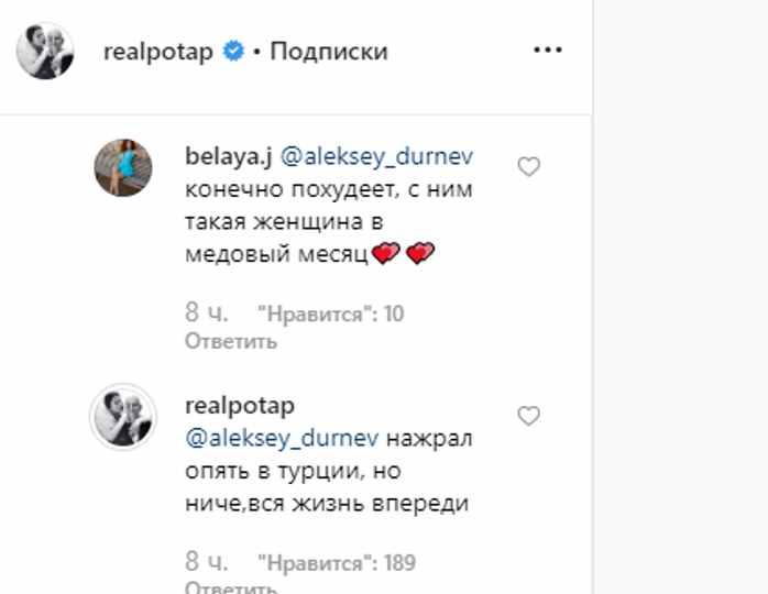 Между тем в комментариях Потап признался, что поправился во время медового месяца. «Нажрал опять в Турции. Но ничего, вся жизнь впереди», — заявил он. По внешнему виду Потапа у него незаметны лишние килограммы. Музыкант в прекрасной физической форме.