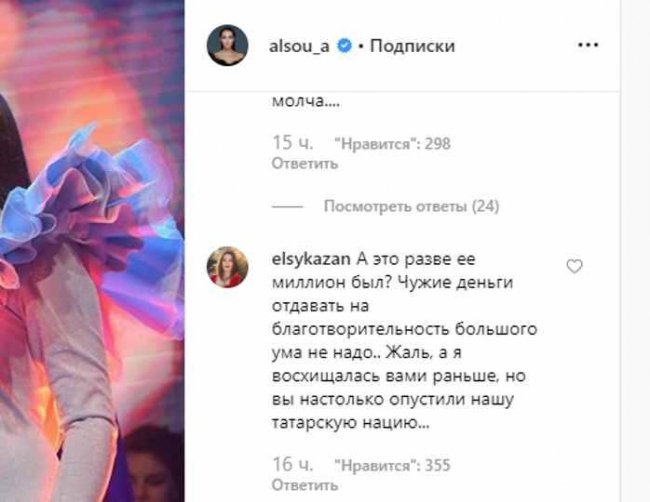 Люди оставляют на страничке певицы гневные комментарии. Алсу/globallookpress.com Певица Алсу впервые за долгое время разместила в Instagram пост. На снимках исполнительница на сцене в Казани. Звезда устроила акцию «Алсу детям» в поддержку казанского хосписа. Звезда выразила признательность всем, кто оказался в этот день ей поддержку. Певица напомнила, что выигранный миллион рублей на шоу «Голос. Дети» дочь Алсу Микелла Абрамова передала в фонд, который занимается лечением детей в казанском хосписе. «Люди, которые там работают, — вот настоящие и подлинные герои! Преклоняюсь перед вашими добрыми сердцами! Здоровья, здоровья и ещё раз здоровья всем нашим детям! И пусть они живут под мирным небом!» — заявила исполнительница. Алсу затравили в соцсетях после возобновления активности/instagram.com/alsou_a/ Между тем в комментариях, которые певица наконец-то открыла для пользователей, многие набросились с критикой на Алсу. В Сети развернулась настоящая травля звезды. «За чужой счет словила очки»: Лоза раскритиковал Алсу, отдавшую миллион на благотворительность Музыкант считает, что певица должна была пожертвовать собственные средства. «Пытаетесь сохранить лицо при плохой игре? До сих пор не понимаю, почему вы публично не извинитесь за произошедшее на «Голосе»? Не пойман, не вор? Или вы думаете, что пропихнуть ребенка вашего еще кому-то было выгодно кроме вас, родителей? Никогда не пишу никому комментарии, тем более публичным личностям, но честно это уже слишком. Вы думаете миллиончиком рейтинг поднять? Творите добро молча», «А это разве ее миллион был? Чужие деньги отдавать на благотворительность большого ума не надо. Жаль, а я восхищалась вами раньше, но вы настолько опустили нашу татарскую нацию», — отметили в комментариях пользователи.