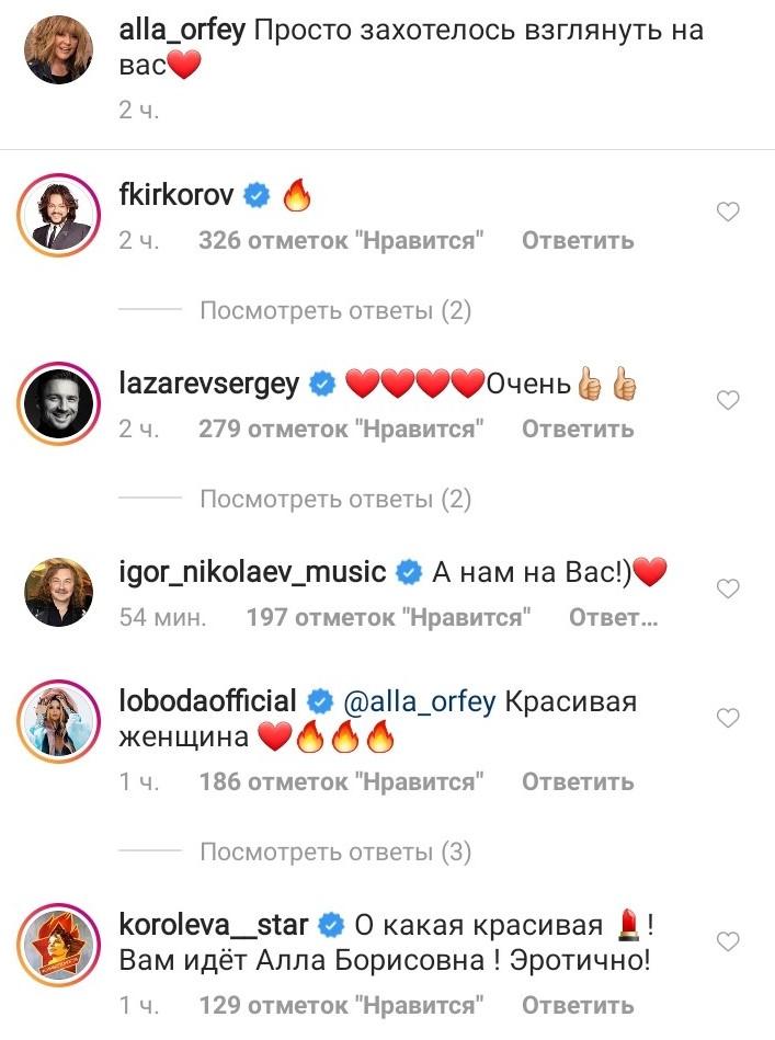 Подписчики остались в восторге от наряда Примадонны. Многие оценили очки Аллы Пугачевой. Новый снимок понравился Филиппу Киркорову, Светлане Лободе, Сергею Лазареву, Игорю Николаеву и Наташе Королевой.