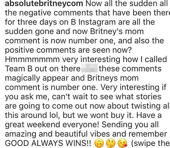 На страничке AbsolutelyBritney была размещена публикация, разоблачающая команду Бритни. «Команда Бритни удаляет все положительные комментарии и оставляет одни негативные, чтобы сохранять иллюзию, что она нуждается в помощи», — начинался пост.