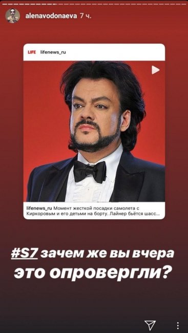 Водонаева поначалу не знала, кому верить: пассажирам или авиакомпании. После того, как певец опубликовал ролик, стало понятно, что Филипп Киркоров не преувеличивал. «Зачем же вы вчера это опровергли?» — спросила Водонаева у представителей авиакомпании в Stories.