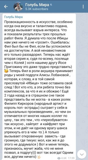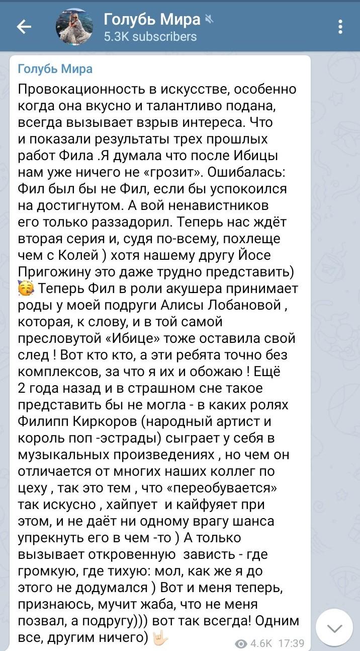Продюсер осталась под впечатлением от тизера, где певец «принимает роды». Яна Рудковская. Фото: globallookpress Яна Рудковская завела Telegram-канал «Голубь мира», где комментирует новости шоу-бизнеса. Продюсер призналась, что название ей подсказала Ксения Собчак – именно так светская львица называет Рудковскую. Звезда поделилась, что в восторге от тизера нового клипа Филиппа Киркорова. Она призналась, что немножко завидует певцу. Яна Рудковская хотела бы сняться в клипе Киркорова вместо подруги. Фото: globallookpress Рудковская подчеркнула, что уважает короля российской эстрады за смелость. Киркоров смог изменить имидж, не изменяя себе. Его клип «Ибица» с Николаем Басковым вызвал скандал в прошлом году из-за провокационных сцен и обилия нецензурной лексики. Яна Рудковская уверена, что клип «Стеснение пропало» будет таким же эпатажным. Киркоров «принял роды» в новом клипе Певец анонсировал очередной ролик, который обещает никого не оставить равнодушным. В тизере Филипп Киркоров «принимает роды» у женщины. Рудковская призналась, что это её подруга Алиса Лобанова, которая также снималась в «Ибице». Продюсер уверена – своим успехом Киркоров вызывает зависть у ненавистников. «Вот и меня теперь, признаюсь, мучит жаба, что не меня позвал, а подругу. Вот так всегда! Одним все, другим ничего», — пожаловалась Яна Рудковская. Яна Рудковская о клипе Киркорова. Скриншот: Telegram-канал «Голубь мира»