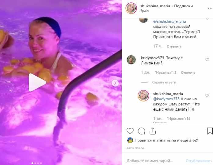 Актриса Мария Шукшина, которая сейчас вместе с детьми отдыхает в Испании, сходила в местную баню. В Instagram она опубликовала несколько снимков, на которых кроме звезды присутствуют ее подруги. При этом в бассейне, который расположен в бане, она купается с лимонами. «Банный день в Испании. Вот люблю с лимонами покупаться», — заявила актриса.