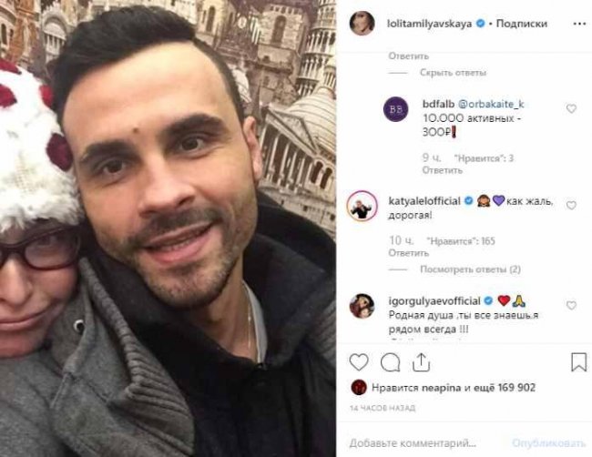 Певица Катя Лель в комментариях к посту Лолиты о расставании с молодым супругом Дмитрием Ивановым выразила свое сожаление по поводу сложившейся ситуации. «Как жаль, дорогая!» — написала она.