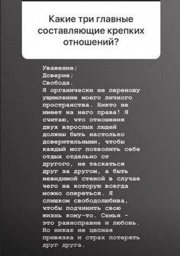 «Я считаю, что отношения двух взрослых людей должны быть настолько доверительными, чтобы каждый мог позволить себе отдых отдельно от другого, не таскаться друг за другом, а быть невидимой стеной в случае чего, на которую всегда можно опереться», — пояснила она.