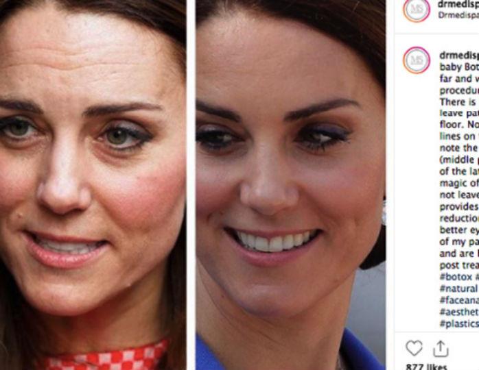 В соцсети пластический хирург разместил два снимка Миддлтон. «Наша Кейт любит „детский ботокс“. Обратите внимание на исчезновение мелких мимических морщин на лбу и как аккуратно приподнялись ее брови», — написал он. На одном фото у герцогини кожа была гладкой, а на другом видны мимические морщины.