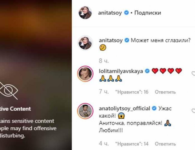 В Instagram в комментариях под ее постом он заявил, что ужаснулся, просмотрев размещенное видео. «Ужас какой! Аниточка, поправляйся, любим!» — заметил Анатолий Цой.
