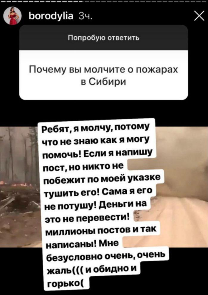 При этом ведущая «Дома-2» призналась, что ей обидно и горько из-за происходящего. КСЕНИЯ БОРОДИНА. ФОТО: INSTAGRAM.COM/BORODYLIA/ Вся Россия и даже зарубежные знаменитости в последние дни публикуют на своих страницах в Сети посты с требованием потушить уже наконец разбушевавшийся на огромной территории лесной пожар в Иркутской области. Бородина поделилась романтическим снимком с мужем из Италии Многие поклонники отметили, что на новом фото ведущая выглядит значительно моложе. Подписчики на страницы знаменитостей в Instagram в комментариях к публикациям звезд напоминают своим кумирам о большом несчастье в стране. Посыпались вопросы на тему пожара и в адрес ведущей реалити-шоу «Дом-2» Ксении Бородиной. Фолловеры интересуются, почему она осталась в стороне и никак не обозначила свое отношение к проблеме. Ответ Ксении Бородиной подписчикам. Фото: страница Ксении Бородиной в Instagram Вопросов, видимо, было так много, что в сторис своего микроблога Ксения была вынуждена объясниться. «Ребят, я молчу, потому что не знаю, как я могу помочь! Если даже я напишу пост, но никто не побежит по моей указке тушить его! Сама я его не потушу! Деньги на это не перевести. Миллионы постов и так написаны. Мне, безусловно, очень, очень жаль и обидно и горько», — пишет ведущая.
