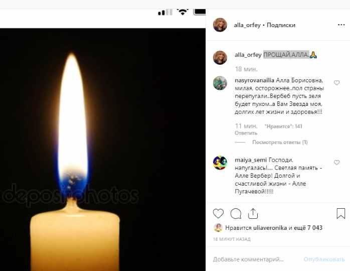 Певица Алла Пугачева изрядно перепугала поклонников, разместив на своей официальной страничке в Instagram фотографию поминальной свечки с подписью: «Прощай, Алла». Многие фанаты подумали, что со звездой отечественной эстрады случилось что-то плохое. На самом деле Алла Пугачёва этим снимком почтила память своей подруги, фэшн-директора ЦУМа Аллы Вербер, которая скончалась 6 августа в Италии.