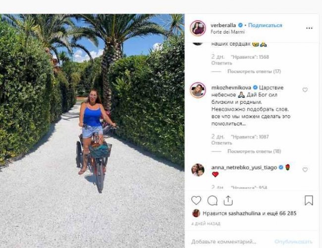 Актриса скорбит в связи с уходом из жизни фэшн-директора ЦУМа. Мария Кожевникова опечалена смертью Вербер/globallookpress.com Актриса Мария Кожевникова не прошла мимо трагедии, которая случилась с 61-летним фэшн-директором ЦУМа Аллой Вербер. Под последним постом женщины в Instagram она оставила свой комментарий. «Царствие небесное. Дай бог сил близким и родным. Невозможно подобрать слов. Все, что мы можем сделать – это помолиться». Кожевникова прокомментировала смерть Аллы Вербер/instagram.com/verberalla/ Отметим, что под постом отметились многие другие звезды российского шоу-бизнеса. В частности, певица Ольга Бузова кратко написала: «Как больно». Здесь же можно увидеть комментарии Лолиты, Сергея Лазарева и многих других. Фэшн-директора ЦУМа знали очень многие звезды. Она была гостьей на вечеринках. «Как больно»: Бузова высказалась после смерти Вербер Певица, как и все звезды шоу-бизнеса, опечалена внезапной смертью фэшн-директора ЦУМа. Последнее крупное мероприятие, которое она посетила, – юбилей композитора Игоря Крутого. Маэстро отмечал праздник в турецком Бодруме. Позвал он туда и свою давнюю подругу. На кадрах она фотографировалась с Крутым и его супругой Ольгой. Женщина была абсолютно счастлива. После Турции Вербер улетела в Италию. Именно там и произошла трагедия. Официальной причиной смерти стал инфаркт. Кроме того, известно, что много лет звезда лечилась от рака крови. Похоронят Аллу Вербер в канадском Торонто. Многие звезды шоу-бизнеса уже заявили, что не смогут туда отправиться, потому что они просто не успеют оформить визу в эту страну, находящуюся в Северной Америке.