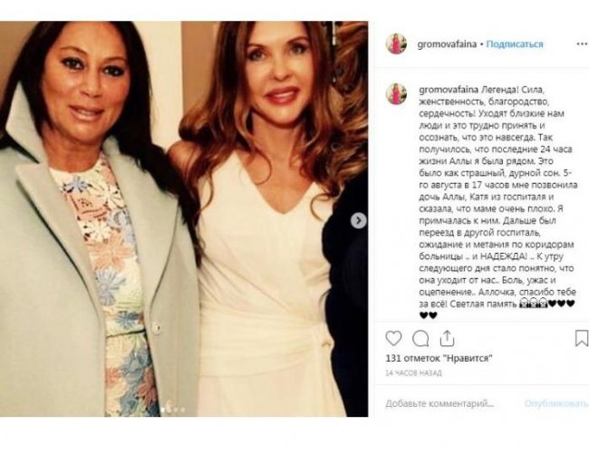 Жена экс-губернатора Московской области рассказала о последнем дне жизни фэшн-директора ЦУМа. Алле Вербер пыталась помочь жена российского политика. Фото: instagram.com/verberalla/ Кончина фэшн-директора ЦУМа Аллы Вербер стала полной неожиданностью не только для ее друзей, но и для ее семьи. Дочь бизнесвумен до последнего надеялась, что все обойдется и Алла Вербер пойдет на поправку. Об этом в Instagram рассказала Фаина Громова, супруга экс-губернатора Московской области Бориса Громова. Алла Вербер незадолго до смерти рассказывала о своей борьбе с раком Фэшн-директор ЦУМа когда-то смогла победить опухоль и редко делилась воспоминаниями по этому поводу. Женщины были подругами, Громова одной из первых приехала в итальянскую больницу к Вербер, чтобы решить организационные вопросы. «Так получилось, что последние 24 часа жизни Аллы я была рядом. Это было как страшный, дурной сон. 5-го августа в 17 часов мне позвонила дочь Аллы – Катя из госпиталя и сказала, что маме очень плохо. Я примчалась к ним. Дальше был переезд в другой госпиталь, ожидание и метания по коридорам больницы… Надежда. К утру следующего дня стало понятно, что она уходит от нас. Боль, ужас и оцепенение. Аллочка, спасибо тебе за всё! Светлая память», – написала супруга политика в блоге. Алла Вербер и Фаина Громова были близкими подругами. Фото: instagram.com/gromovafaina/ Напомним, Аллы Вербер не стало 6 августа. Фэшн-директор ЦУМа отдыхала с семьей в Италии, когда внезапно ей стало плохо. Врачи безуспешно боролись за жизнь бизнес-леди. Алла Вербер скончалась от менингококкового сепсиса, не приходя в сознание.