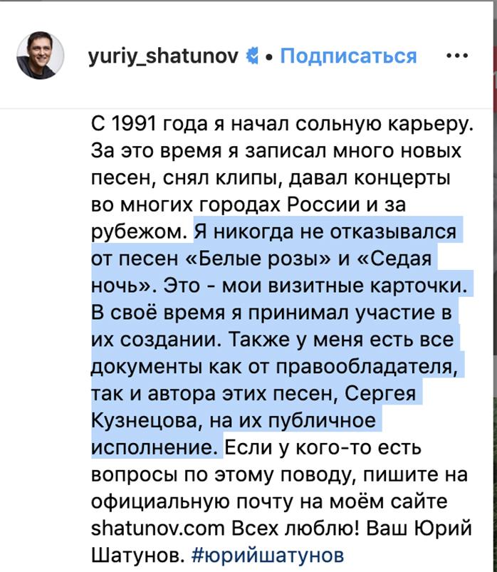 Наш портал Teleprogramma.Pro связался с помощником Разина, Сергеем. Тот сказал, что продюсер не будет давать каких-то комментариев по поводу Шатунова. Но если на Дне города в Москве Юрий хочет исполнить хит «Белые розы», то сперва он должен купить это право у ООО «Честная музыка».