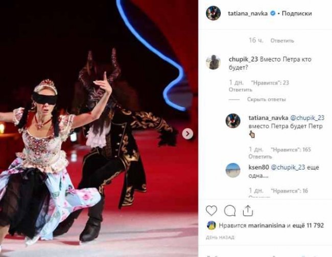 Навка заверила, что Чернышев обязательно в ближайшее время присоединится к ее команде. Один из пользователей напрямую спросил, кто заменит Петра в проекте. На это Татьяна Навка в довольно резкой форме ответила: «Вместо Петра будет Петр».