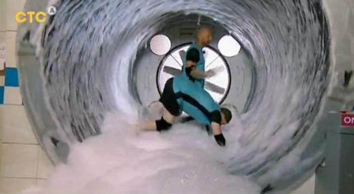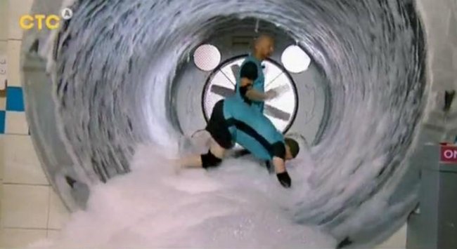 Сергей Шнуров предложил Шацу и Маркони выполнить задание под названием «Большая стирка». Чтобы добраться до ключа, знаменитостям нужно было пробежаться в мыльной пене внутри большой центрифуги. Владимир с легкостью пустился бежать, но 54-летнему капитану команды это оказалось не по силам.