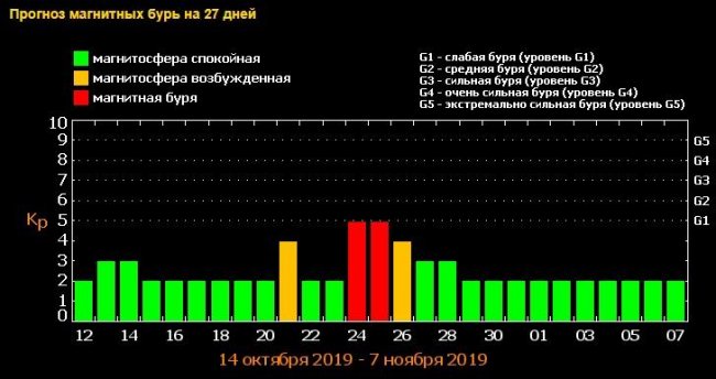 Специалисты лаборатории рентгеновской астрономии Солнца ФИАН прогнозируют серьезную магнитную бурю на конец октября. Она ожидается с 24 по 26 число. По шкале ученый она достигнет уровня G1, то есть будет слабой, однако это обещает быть полноценной магнитной бурей.