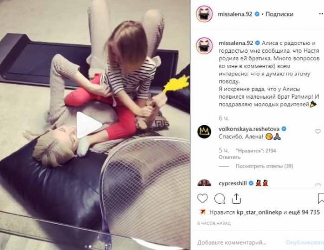 «Я искренне рада, что у Алисы появился маленький брат Ратмир! И поздравляю молодых родителей», — заявила довольная Алена Шишкова, которая, надо сказать, в прекрасных отношениях как с рэпером, так и со всей его семьей.