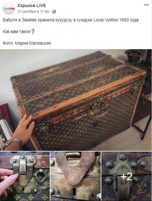 А тем временем, такой предмет можно было продать коллекционерам за тысячи евро. Бренду Louis Vuitton больше 150 лет. Фото: Christophe Morin via www.imago-i Красиво жить не запретишь. Рядовых украинцев это тоже касается. Многие международные СМИ облетела новость о раритетном сундуке бренда Louis Vuitton, который был найден в городке Змиеве Харковской области. Весьма недешевый предмет обихода стоял в доме у самой обычной бабули, которая хранила в нем кукурузу. Об этом в Facebook рассказала местная жительница Мария Малевская. Она же выложила в социальную сеть фотографии сундука, на которых видны фирменные вензеля производителя на замках. Вещь была произведена в 1880 году. После этой публикации в социальной сети к бабуле в Змиев приехали международные телеканалы. Фото: facebook.com/livekharkov/ Естественно, сразу после обнаружения ценного предмета (за него можно выручить от 10 тысяч евро) его сразу же забрали в местный музей. А то вдруг бабуля туда картошку засунет… Для тех, кто ничего не понимает в моде, добавим, что Louis Vuitton — это один из старейших Модных домов Франции, производит дорогие одежду, обувь и аксессуары. Клиентами фирмы являются даже королевские семьи. А начинал этот люксовый бренд с чемоданов, ну и сундуки делал неплохо.