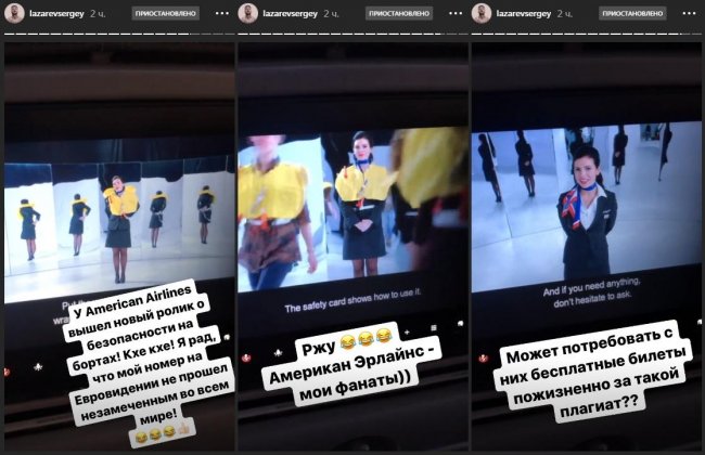 Певец Сергей Лазарев усмотрел в новом ролике о безопасности авиакомпании American Airlines плагиат на свое выступление на конкурсе «Евровидение-2019». Своими мыслями по этому поводу 36-летний артист поделился с поклонниками в Instagram.