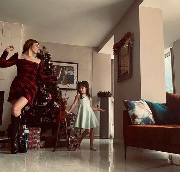 На личной страничке в Instagram Нур Феттахоглу поделилась свежим снимком. У новогодней елочки вместе с шестилетней дочкой Элисой Гюзин актриса позировала в мини-платье с квадратным вырезом оттенка спелой вишни. Партнерша Халита Эргенча отдала предпочтение приталенному наряду. Ее образ дополнили сапоги. Не секрет, что Нур всегда обладала хрупкой фигурой, которую она сохранила даже после родов.