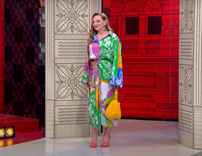 «Наряд напоминает технику пэчворк, очень модную в нынешнем сезоне. Коллекции нынешнего сезона создавались в пандемию и тема пэчворка, а также разных других способов сохранения природы и собственного бюджета была для дизайнеров очень близка. Имеет смысл задуматься о ней, потому что нынешнее лето – это повод ликовать. Мы все еще находимся в довольно нестабильной эпидемиологической ситуации и в тот момент, когда мы можем радоваться, мы должны радоваться максимально активно. Техника пэчворк, даже очень простенькая, может быть, не такая мультиколористичная, всегда будет контрастной и всегда вам поможет эту радость выразить в вашем костюме», — прокомментировала эксперт моды.