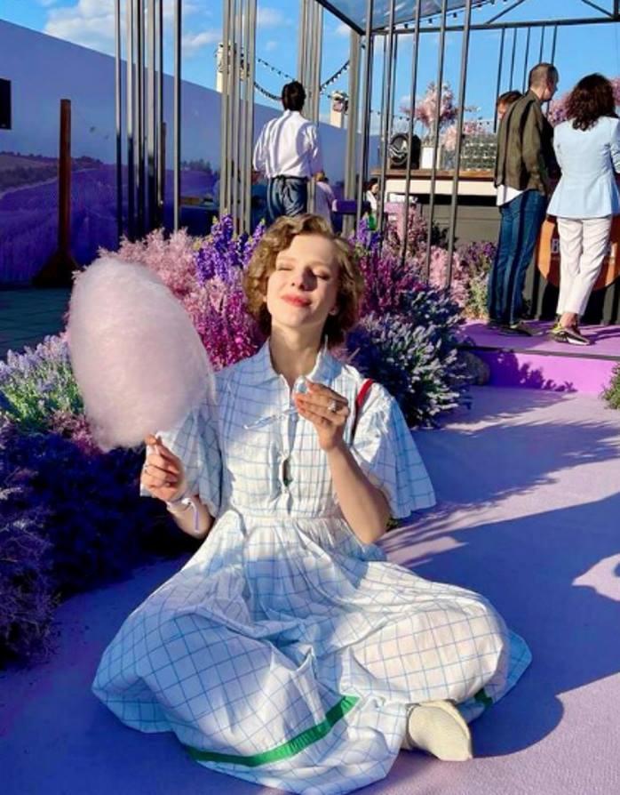 Лиза Арзамасова в клетчатом платье-солнце полакомилась сладкой ватой. Фото: Instagram.com/liza_arzamasova