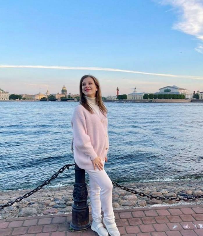 На прогулке по Санкт-Петербургу Лиза отметилась в белых слаксах и пудровом мягком джемпере. Фото: Instagram.com/liza_arzamasova
