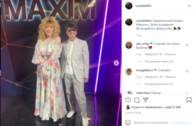 Всемирно знаменитый кутюрье создал одеяние для Примадонны на юбилей мужа. Алла Пугачева. Фото: Global look press 72-летняя Алла Пугачева редко выходит в свет или принимает участие в официальных мероприятиях. По завершении карьеры легендарная артистка посвятила себя семье — мужу Максиму Галкину и двум деткам, семилетним Лизе и Гарри. Честь увидеть Примадонну лично выпадает давним друзьям и коллегам Аллы Борисовны или, что редкость, — на дружеских вечерах и памятных концертах. Поводом для недавнего появления Примадонны перед публикой стал юбилей Максима Галкина. Мужу артистки исполнилось 45 лет, и отметить день рождения шоумен решил с грандиозным масштабом. Среди гостей — весь свет отечественного шоу-бизнеса. И для празднества Пугачева продумала свой образ до мелочей, отдав предпочтение платью от Валентина Юдашкина. Алла Пугачева и Валентин Юдашкин. Фото: instagram.com/vyudashkin/ Российский кутюрье с мировой известностью, Валентин Юдашкин давно создает для Примадонны наряды. И в этот раз модельер вновь порадовал свою музу женственным одеянием — струящимся платьем в пол с нежно-розовым цветочным принтом и открытыми плечами. Изюминкой в образе стали полупрозрачные перчатки на руках Примадонны. И Алла Борисовна осталась в восторге от платья. Она публично поблагодарила Валентина Юдашкина. «Спасибо за платье, Валечка!» — написала Пугачева Юдашкину. Судя по комментариям многочисленных поклонников, наряд понравился не только Пугачевой. «Платье шикарное, летнее, воздушное! Вам очень идет», «Шикарное платье!», «Платье нежное-нежное и красивое-красивое», «Какое красивое платье на АБ! Нежнятина!», «Алла Борисовна такая нежная в этом платье», — написали некоторые люди.