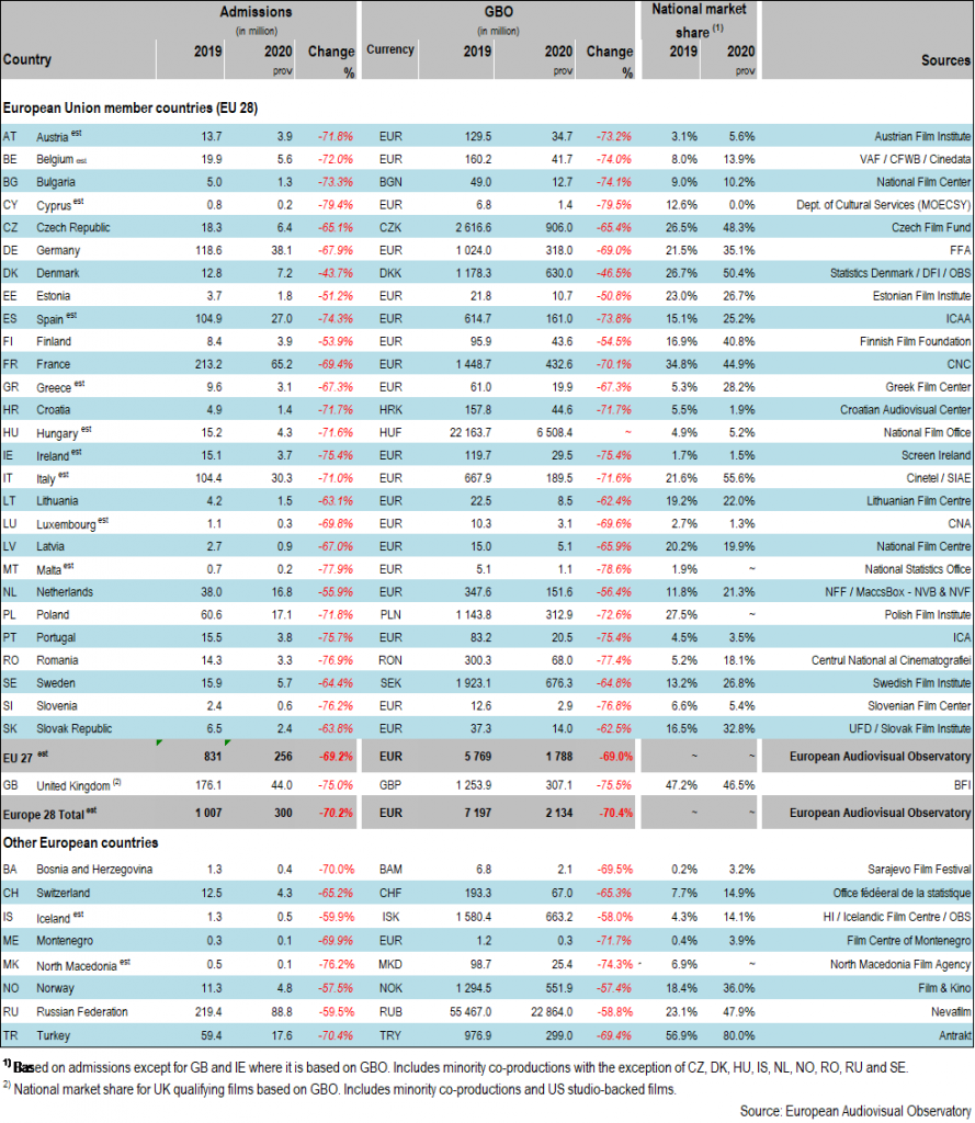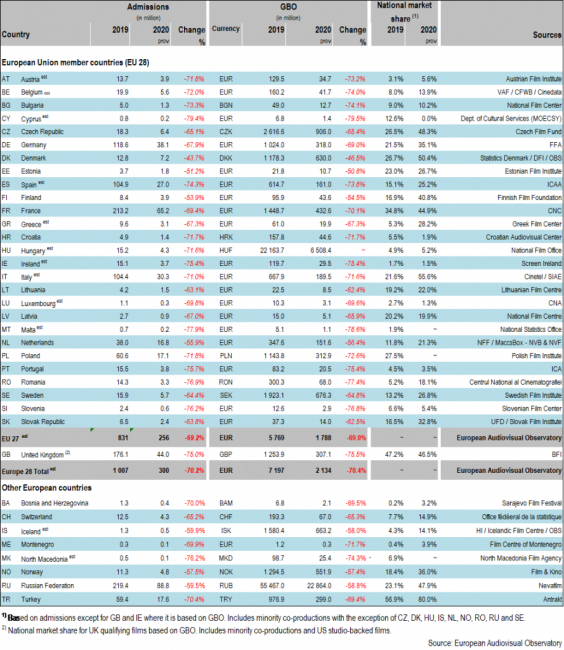 В итоге кинотеатральный рынок в 2020 году пережил коллапс, посещаемость в ЕС и Великобритании упала на 70,2% — с миллиона проданных билетов в 2019 (высочайший показатель с 2004 года) до 300 тыс в 2020. Аналогично упали и кассовые сборы — с 7,2 млрд до 2,13 млрд — падение составило 70,4% при том, что средняя цена билета не претерпела существенных изменений, оставаясь в районе 7,1 евро. Посещаемость обвалилась в каждой европейской стране, однако масштабы катастрофы везде разные. Наименьшее падение по отношению к предыдущему году зафиксировано в Дании (-44%), Эстонии (-51%), Финляндии (-54%) и Нидерландах (-56%). На шести территориях посещаемость снизилась более чем на 75% — речь идет о Кипре (-79%), Румынии (-77%), Словении (-76%), Португалии (-76%), Ирландии (-75%) и Великобритании (-75%). За пределами ЕС и Великобритании кинотеатральный рынок понес сравнительно меньшие потери в Норвегии (-57,5%), России (-59,5%) и Исландии (-59,9%).