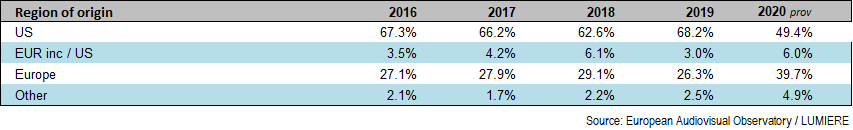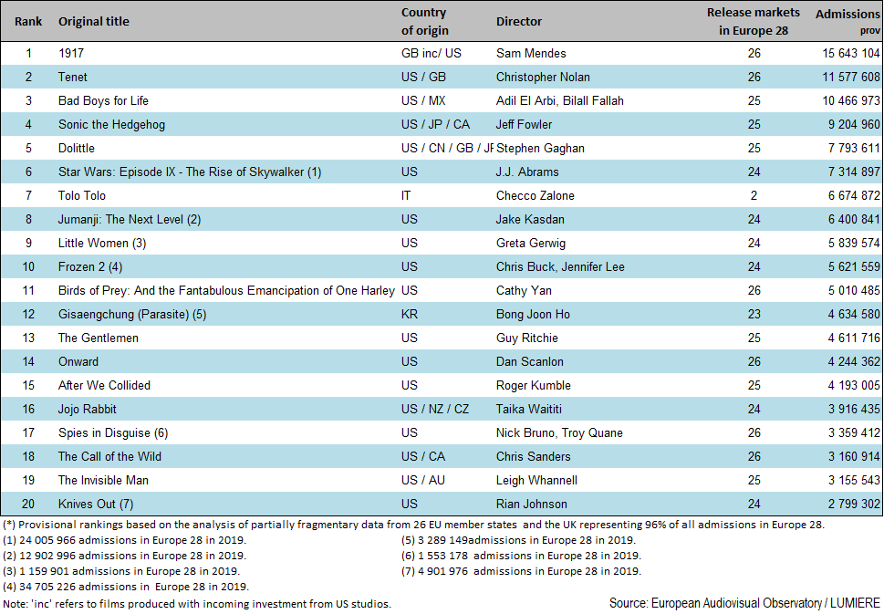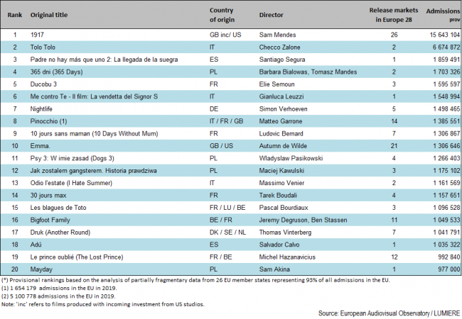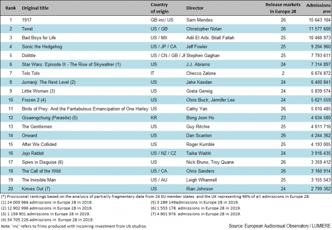 В двадцатку лидеров по итогам года вошло всего два проекта европейского производства: созданная преимущественно в Великобритании военная драма «1917» (1 место), а также итальянская комедия «Tolo Tolo» (7 место с 6,6 млн зрителей). К числу прочих наиболее успешных европейских картин, не вошедших однако в Топ-20, можно отнести испанскую комедию «Папа бывает только один 2: бабушка приехала» / «Padre no hay más que uno 2: La llegada de la suegra» (1,2 млн зрителей), польский эротический триллер «365 дней» (1.7 млн), а также французскую комедию «Ducobo» (1,6 млн). Доля рынка европейских фильмов выросла в отсутствии американских блокбастеров Отсутствие американских блокбастеров отразилось на показателях посещаемости фильмов, отсортированных по признаку страны производства. В ЕС и Великобритании число проданных билетов на картины из США упало на 78%, а посещаемость европейских лент снизилась «всего лишь» на 55%. Количество зрителей, сходивших на европейские фильмы, созданные в Европе с привлечением инвестиций из США, а также на картины из других частей света, уменьшилось на 41%. Таким образом доля европейского кино на собственном рынке достигла рекордно высокой отметки — почти 40% проданных билетов пришлось на европейские фильмы (для сравнения — данный показатель составлял 26,3% в 2019). Во многом это было достигнуто за счет того, что на национальные фильмы пришлась необычайно высокая доля на рынках в странах производства.