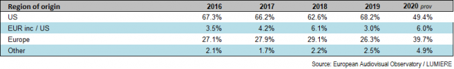 Доля американских фильмов на европейском рынке, наоборот, снизилась с 68,2% до 49,4% и продемонстрировала наиболее низкий показатель в новейшей истории. На европейские фильмы с американскими инвестициями пришлось 6% проданных билетов против 3% в 2019. Аналогичный показатель для картин из других частей света составил 4,9% (против 2,5% годом ранее). Во многих европейских странах ленты местного производства заняли рекордно высокую долю собственного рынка. Среди наиболее преуспевших в этом отношении стран оказались Италия (55,6% рынка которой досталось итальянским же лентам), Дания (50,4%), Чехия (48,3%), Великобритания (46,5%), Франция (44,9%), Финляндия (40,8%) и Германия (35,1%). За пределами ЕС наибольшую долю собственного рынка получило кино Турции (80%). В России местным фильмам досталось 47,9% рынка. Кинопроизводство, остановившееся в марте 2020 года, стало постепенно запускаться в начале лета. Во время второй волны поздней осенью и зимой, когда закрылись кинотеатры, съемки продолжались. Таким образом снижение объема выпускаемой кинопродукции в ЕС и Великобритании оказалось не столь катастрофическим, как падение кинотеатральной посещаемости. В 2020 году было создано 1403 полнометражных фильма против 2007 в 2019 — падение составило «всего» 30%.