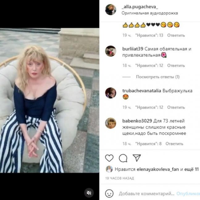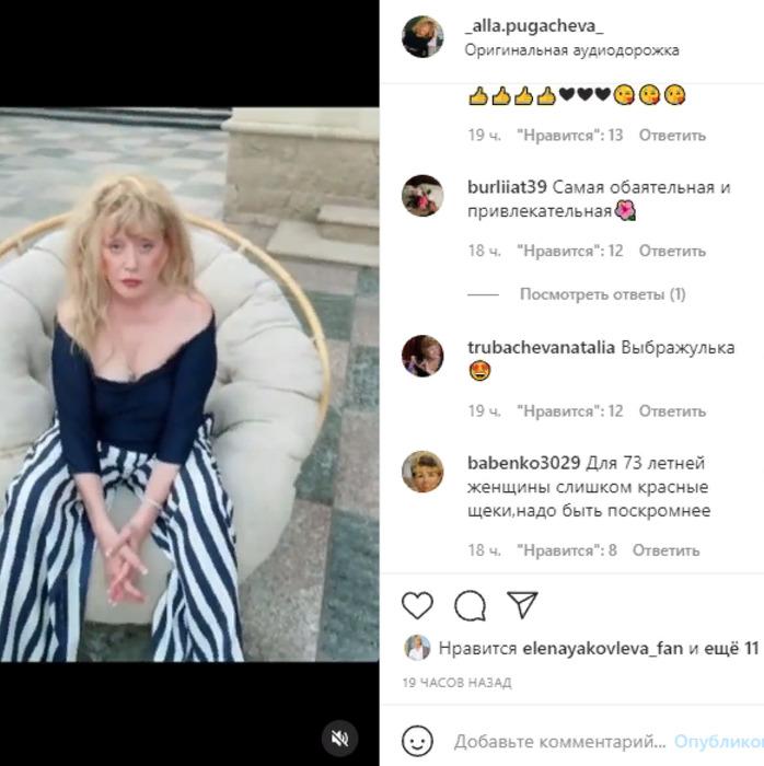 «Самая обаятельная и привлекательная», «Согласна, очень красивая для 70 лет», «Для 73 летней женщины слишком красные щеки,надо быть поскромнее», «Выбражулька», «Аллочка Борисовна вы прелесть», «Влюблённая женщина всегда меняется…. Сегодня такая ,а завтра другая… Когда гармония в душе это отражается в лице», «Лучше бы не не показывали. Испортила такой замечательный ролик Максима. Тщеславия и высокомерия через край!», — пишут разные фолловеры в комментариях.