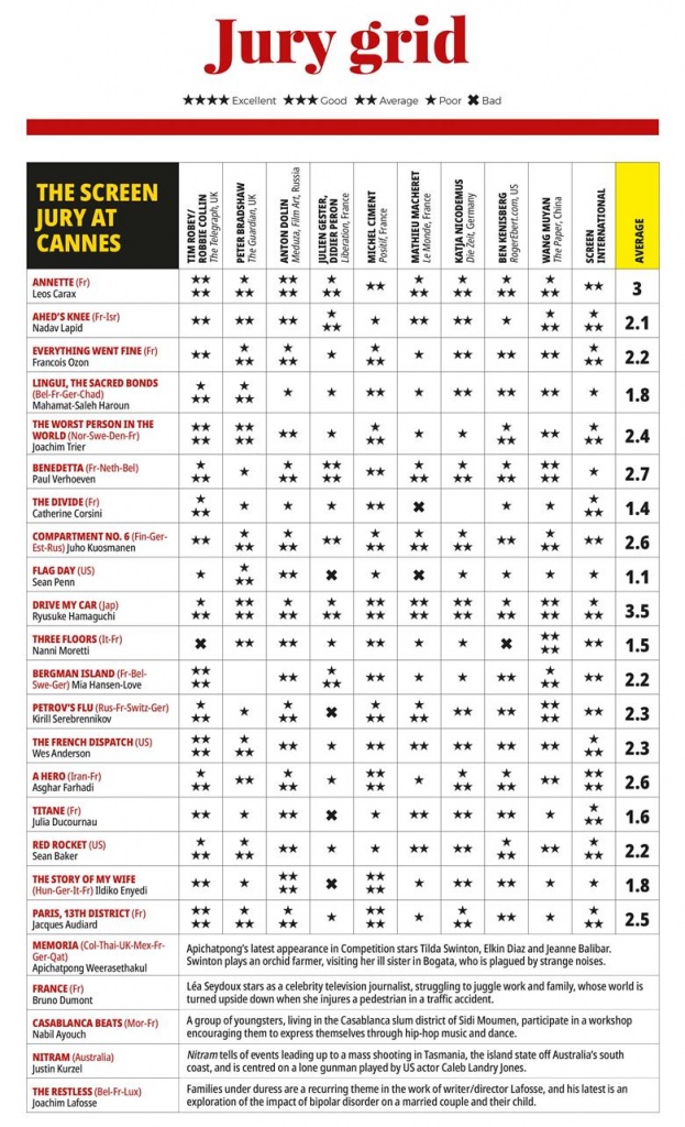 Следом за драмой Хамагути, снятой по мотивам одноименного рассказа Харуки Мураками, расположились философский мюзикл «Аннетт» Леоса Каракса с отрывом в 0,5 балла (3,0) и «Искушение» Пола Верховена, эротическая драма про монахиню Бенедетту, с оценкой 2,7. Новый фильм Каракса о стендап-комике и его жене-певице в исполнении Адама Драйвера и Марион Котийяр собрал достаточно противоречивые отзывы фестивальной аудитории, тогда как кинокритики журнала Screen почти единодушно отдали ему 3 балла из 4. А по «Искушению» мнения критиков разделились – одни поставили откровенному фильму Верховена 1 балл (например, Питер Брэдшоу из The Guardian), другие – 4 балла (в том числе Джулин Гестер из французской газеты Libération).
