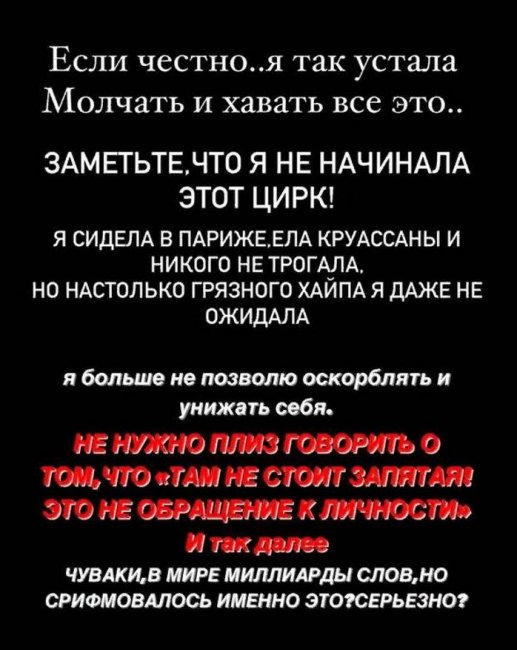 «Если честно, я так устала молчать и хавать все это. Заметьте, что не я начинала этот цирк! Я сидела в Париже, ела круассаны и никого не трогала. Но настолько грязного хайпа я даже не ожидала. Я больше не позволю оскорблять и унижать себя. Не нужно, плиз, говорить о том, что «там не стоит запятая, это не обращение к личности» и так далее. Чуваки, в мире миллиарды слов, но срифмовать именно это? Серьезно?», — обратилась Карнавал к обиженному Криду.