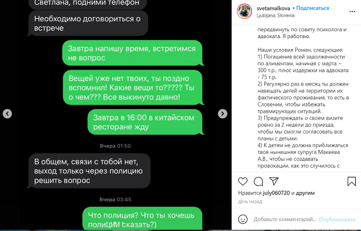 Светлана требует выплаты алиментов и долга. Светлана Малькова. Фото: instagram.com/svetamalkova В эти дни Анастасия Макеева и Роман Мальков находятся в Словении. Актриса приехала в Любляну с гастролями, а ее новый муж тем временем пытается встретиться со своими сыновьями и дочкой. Они, по словам Светланы Мальковой, находятся на запланированном отдыхе, поэтому свидания пока не получилось. К тому же многодетная мама выставила ряд требований бывшему мужу. В их числе погашение задолженности по алиментам, начиная с марта, а это порядка 300 тысяч рублей, плюс издержки на адвоката – 75 тысяч рублей. Об этом Светлана объявила в своем Instagram. Светлана Малькова выставила требования бывшему мужу. Скриншот: instagram.com/svetamalkova «К детям не должна приближаться твоя нынешняя супруга Макеева А.В., чтобы не создавать провокации, как это случилось с Андреем и Анютой. Если тебя не устраивают данные требования, просьба предоставить своего адвоката. Только, пожалуйста, не того, кто составлял предыдущие иски. Все-таки мой адвокат не умеет разговаривать на не профессиональном языке», — написала Малькова. Кроме того, Светлана требует, чтобы Роман посещал детей раз в месяц. «Регулярно раз в месяц ты должен навещать детей на территории их фактического проживания, то есть в Словении, чтобы избежать травмирующих ситуаций. Предупреждать о своем визите ровно за 2 недели до приезда, чтобы мы смогли согласовать все планы с детьми», — написала Малькова. Напомним, старший сын Романа, 16-летний Андрей, еще весной переехал к отцу и мачехе в Москву, а трое младших остались жить с мамой в Любляне.