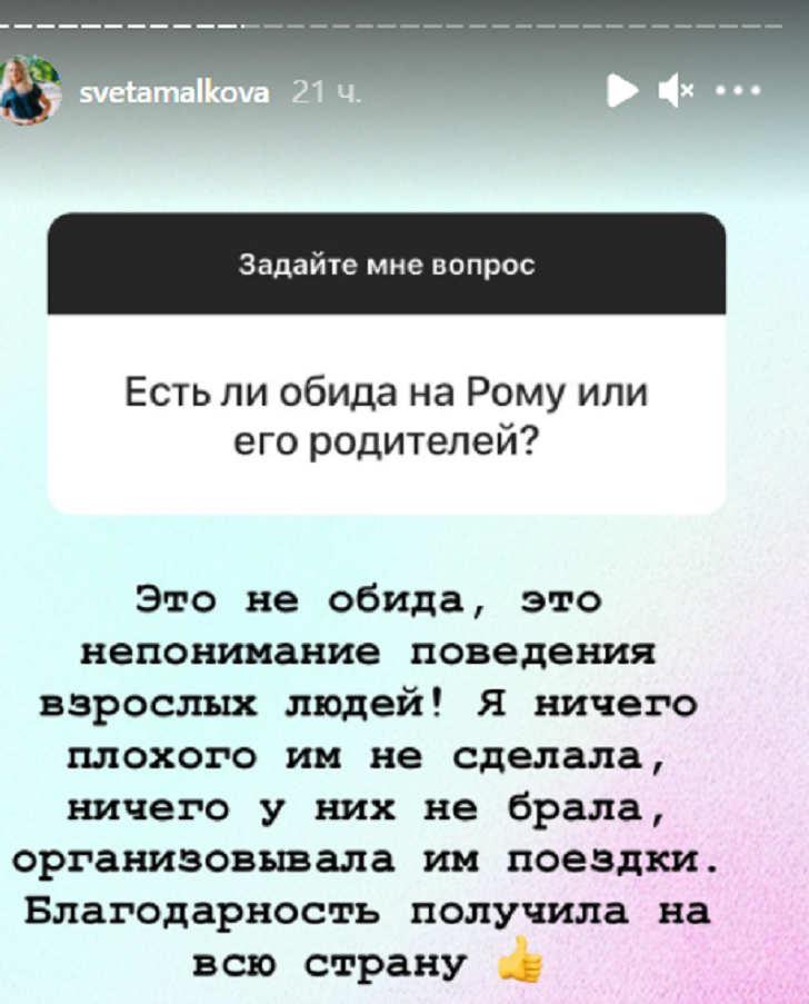 Светлана осталась жить в Словении с тремя детьми. Светлана Малькова. Фото: instagram.com/svetamalkova Накануне Роман Мальков и его бывшая супруга Светлана приняли участие в седьмом заседании суда. Муж Анастасии Макеевой утверждает, что алименты троим детям он переводил. В качестве доказательств бизнесмен передал соответствующие документы. Светлана же продолжает утверждать, что деньги она не получает. В своем микроблоге многодетная мама провела сессию вопросов и ответов и опубликовала некоторые из них. Так, она отметила, что не понимает поведение родителей бывшего мужа. Светлана Малькова. Скриншот: instagram.com/svetamalkova «Это не обида, это непонимание поведения взрослых людей. Я ничего плохого им не сделала, ничего у них не брала, организовывала им поездки. Благодарность получила на всю страну!», — написала Малькова. Добавим, в суде Роман Мальков озвучил свои требования. Строитель хочет видеть детей в России. Светлана же отмечает что в Словении у них уже устроен быт и начался учебный год.