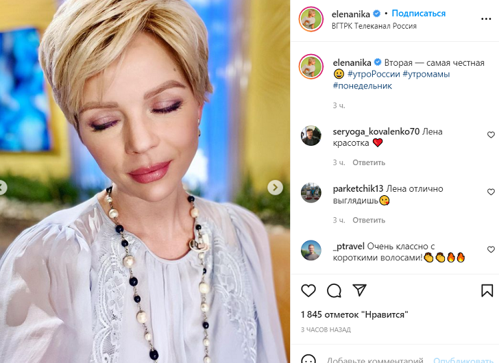 Телезвезда ведет утреннюю программу на канале «Россия 1». Елена Николаева. Фото: instagram.com/elenanika/ Ближе к концу декабря телеведущая Елена Николаева родила первенца. Малыша назвали Сашей. А спустя всего месяц звезда утренней программы на канале «Россия 1» вернулась к работе. В своем инстаграме она показала кадры из студии. «Вторая – самая честная», — написала Николаева, запечатлевшись на этом снимке с закрытыми глазами. Елена Николаева. Скриншот: instagram.com/elenanika/ Фанаты отметили, что Елена отлично выглядит. «Красотка! Вам идет с короткими волосами. Вы сегодня в телевизоре такая воздушная», — писали пользователи Сети. Напомним, в прошлом году Елена Николаева вышла замуж за бывшего возлюбленного Анастасии Волочковой – Игоря Вдовина. Они познакомились несколько лет назад на одном из бизнес-форумов. Блондинка быстро нашла общий язык с дочкой бизнесмена от балерины Ариадной, которая год назад переехала в дом отца. Еще больше интересных роликов на нашем YouTube-канале.