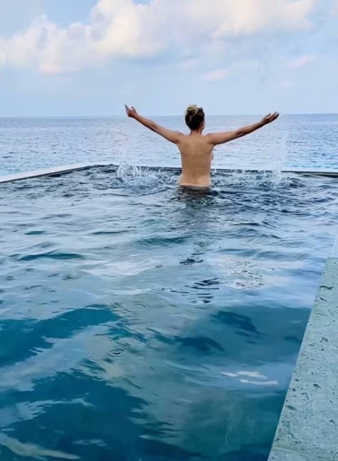 Минувшим днем Олег и Марина вновь отправились купаться в бассейн под открытым небом. И жена музыканта решила полностью обнажиться для эффектных кадров. Она позировала мужу, стоя спиной, и когда выныривала из воды, было видно — на фигуристой красавице нет ровным счетом ничего.
