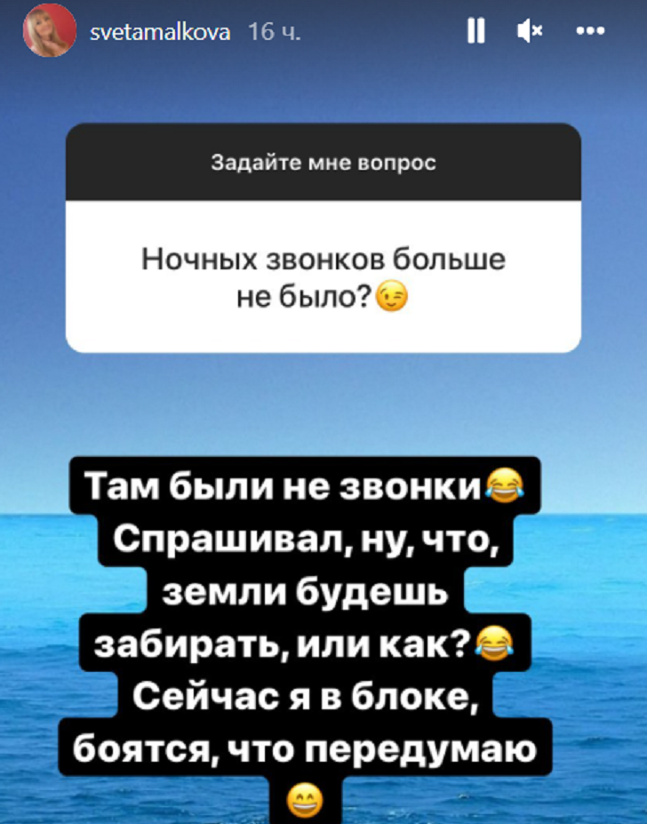 Светлана Малькова живет в Словении. Светлана Малькова. Фото: instagram.com/svetamalkova/ С официального развода Светланы и Романа Мальковых прошел почти год. Бывшие супруги до сих пор выясняют отношения и спорят о размере алиментов. А недавно художница призналась, что экс-супруг звонит ей по ночам. Фолловеры Светланы поинтересовались, продолжаются ли звонки. Страница Светланы Мальковой. Скриншот: instagram.com/svetamalkova/ «Там не звонки были. Спрашивал: «Ну, что? Земли забирать будешь или как?». Сейчас я в блоке. Боятся, то передумаю», — написала Малькова. Напомним, ранее Анастасия Макеева сообщала, что ее муж готов отдать бывшей жене и детям дом в регионе, а также земельные участки, но Светлана сама не хочет воспользоваться таким предложением. Еще больше интересных роликов на нашем YouTube-канале.