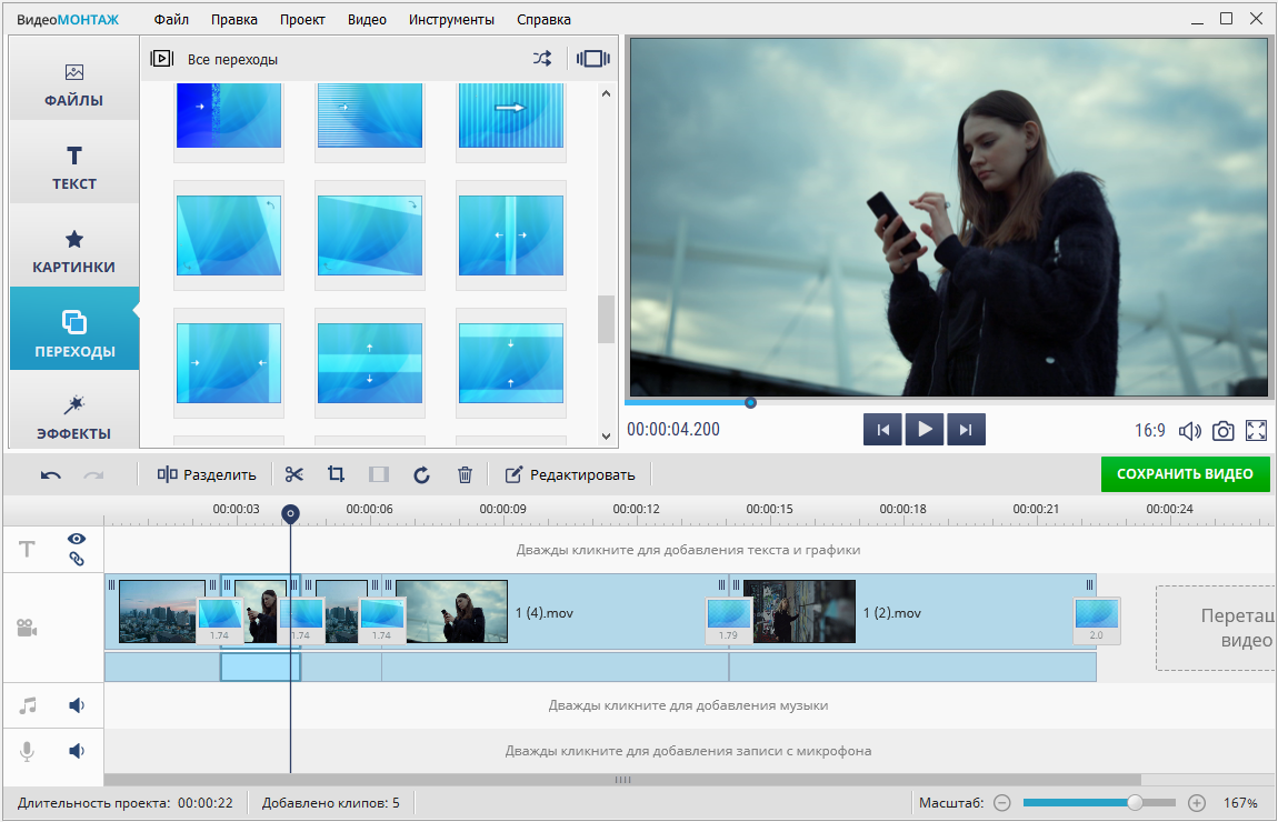 Они сгладят место соединения фрагментов. Креативные переходы можно найти в одноименной вкладке. Чтобы применить анимацию, перетащите ее на стык двух видео.
