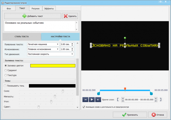 Стиль текста можно отредактировать, кликнув по нему дважды. Разрешается изменить шрифт, заливку, тень, тип и скорость движения, размер и другие параметры.