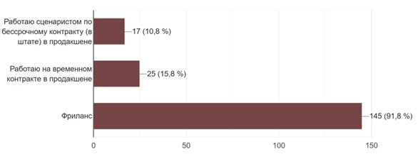 Согласно данным, менее 11% всех работающих сценаристов могут похвастаться тем, что зачислены в штат компании. И даже работая в штате, половина из них указала, что параллельно пытается подрабатывать как фрилансеры.