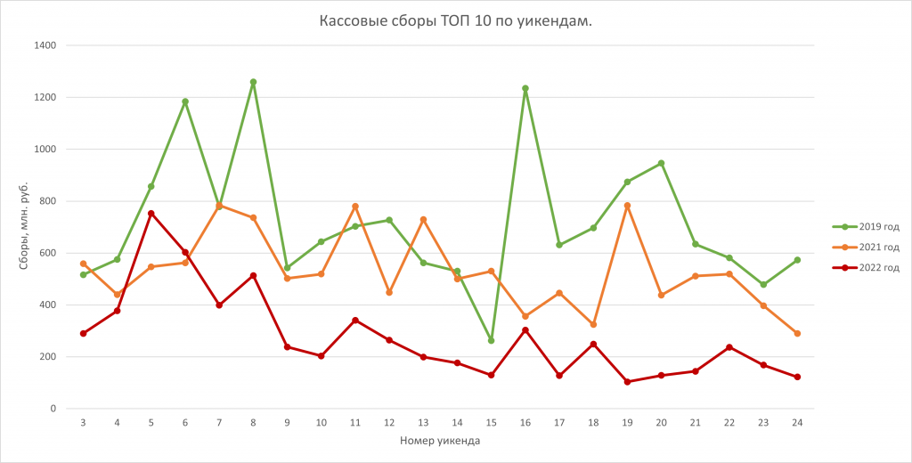 В начале февраля, с выходом нескольких голливудских блокбастеров, кассовые сборы первой десятки стали расти и уже к 7 уикенду сборы Топ-10 взлетели до 754 млн рублей – самого высокого значения за весь 2022 год после завершения Новогодней битвы. До конца февраля кривая кассовых сборов плавно ползла вниз, но эксперты не понижали своих оценок, ожидая улучшения ситуации на рынке по мере выхода крупных голливудских блокбастеров и дальнейшего ослабления противоковидных ограничений.
