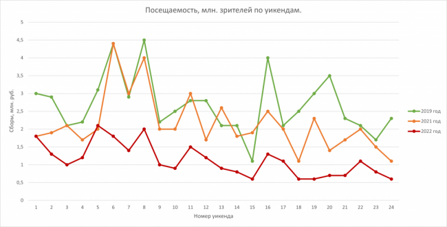 По данным портала ПрофиСинема, падение выручки за период апрель–июнь составило 73% по сравнению с допандемийным 2019 и 62,5% по сравнению с 2021 годом.